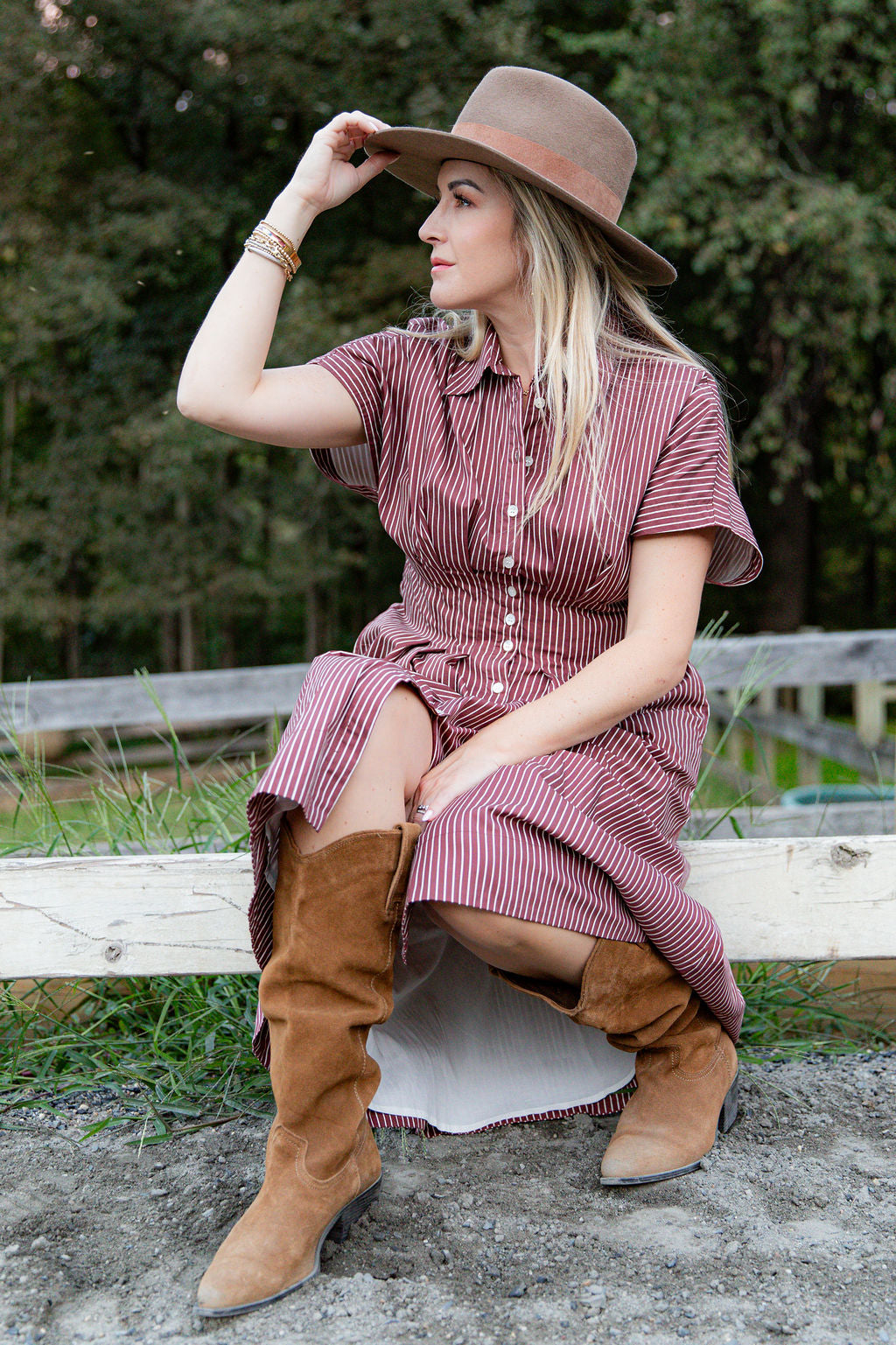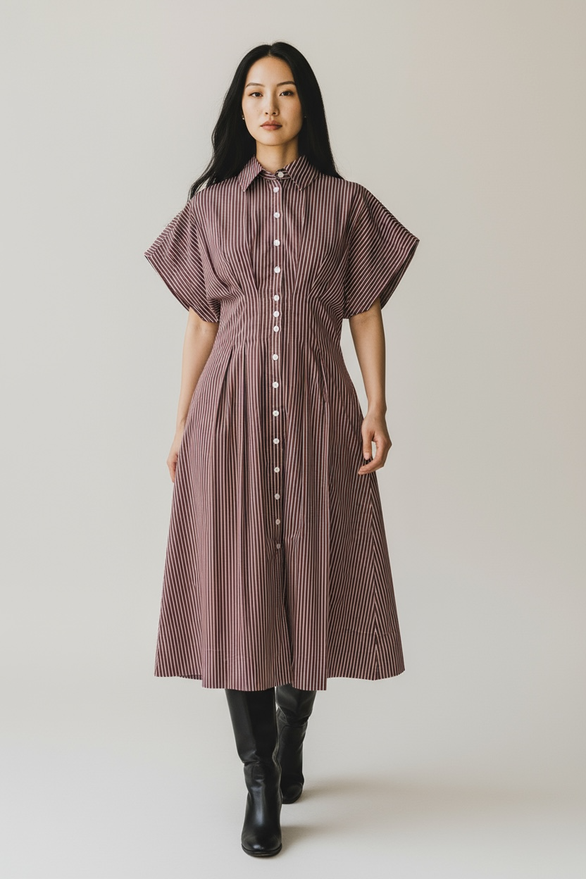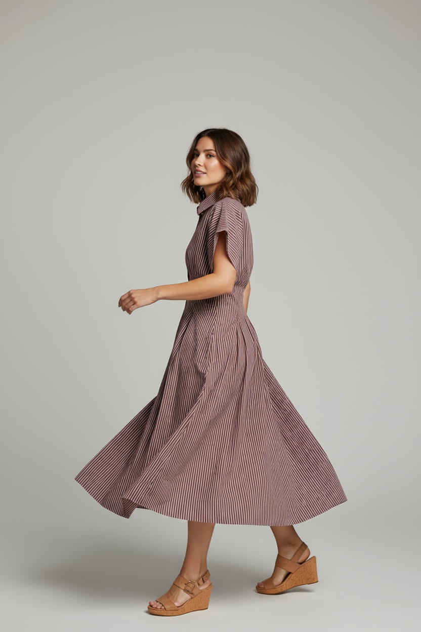 Meet the Chiara Dress, where timeless tailoring meets modern ease. Crafted from 100% European cotton poplin with a breathable bamboo lyocell linings, this mid-length mother of pearl button-down brings structure and softness in perfect harmony. The rich Cinnamon Stripe—a refined blend of chocolate and ivory—pairs beautifully with its versatile short sleeve that can snap into a cap sleeve for a polished or relaxed look. UPF 50+ protection keeps you sun-safe from business lunches to coastal dinners.